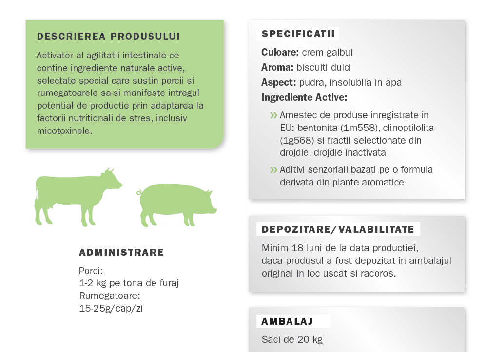 Inhibitor microtoxine ANCO FIT | Inhibitor micotoxine – activator al agilitatii intestinale pentru porci si rumegatoare. Actioneaza prin blocarea, neutralizarea sau reducerea efectelor toxice ale micotoxinelor.
