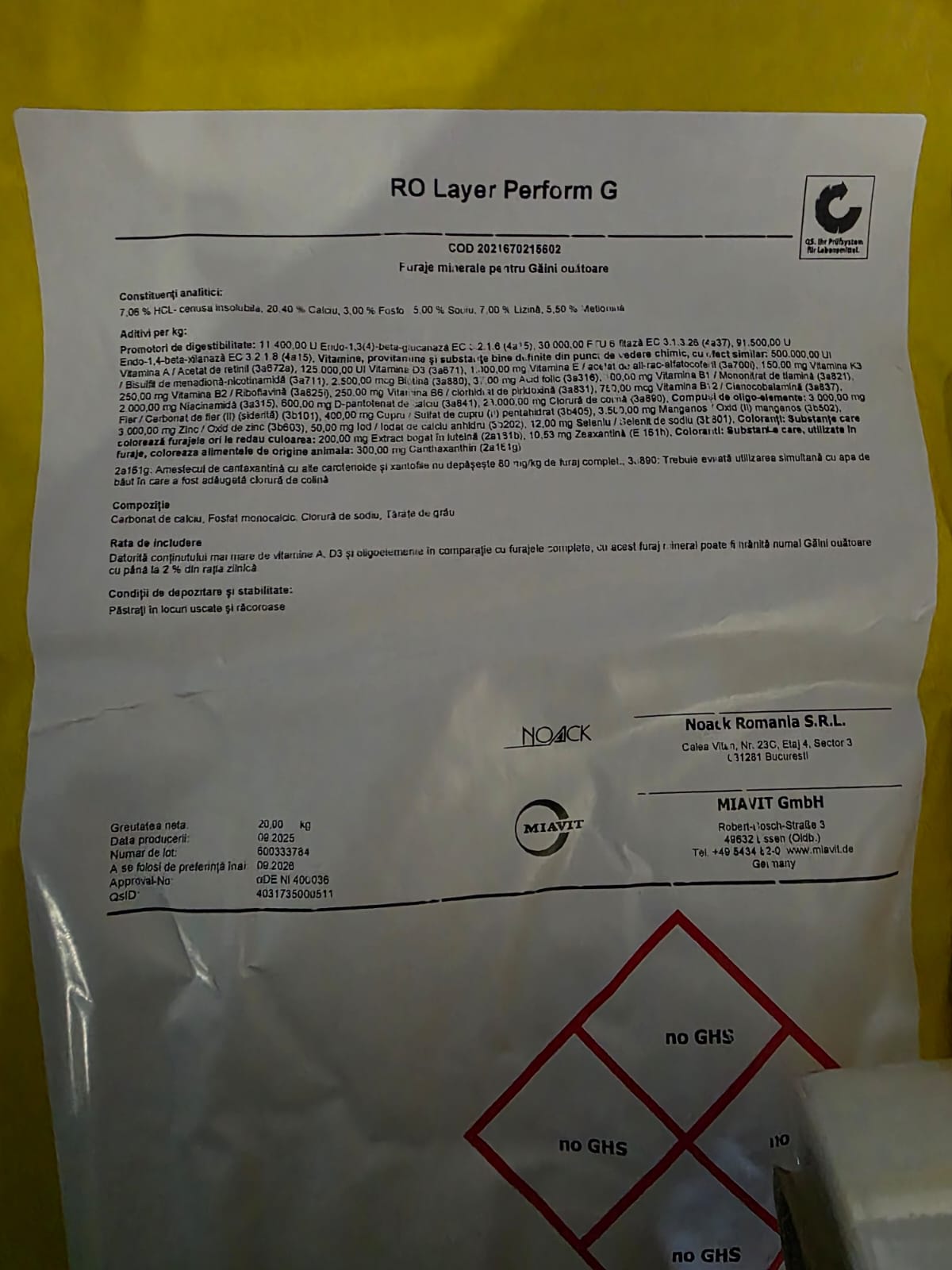 Produsele sunt ambalate in saci de hartie de 20 de kg. Premixul de 2 % cu colorant intensiv aduce culoarea galbenusului intr-un portocaliu. Premixul vitamino mineral de 2 % cuprinde toate microelementele esentiale pentru o nutritie echilibrata.
